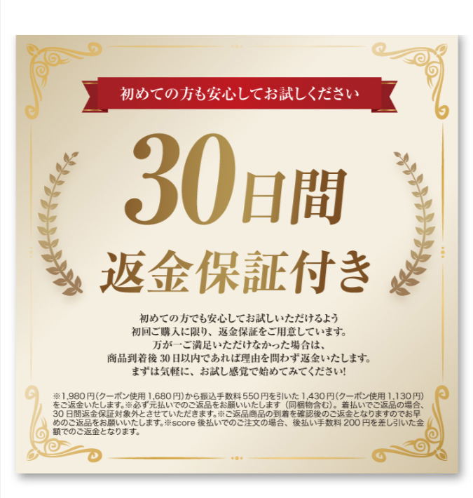 単なる初回価格の安さだけでなく、「100%正規品保証」「30日間全額返金保証」「回数縛りなし」という安心感まで含めて、