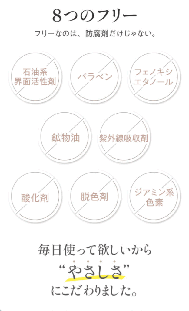 特に注目したいのは、「防腐剤フリー」である点と、8つの無添加を実現している点です。