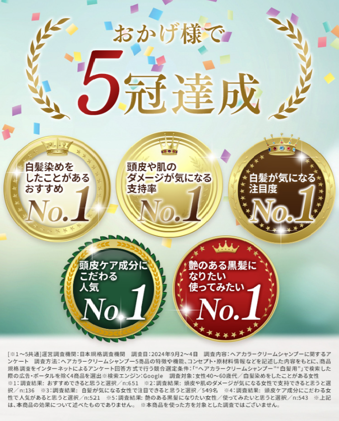 具体的には、「白髪染めをしたことがある人のおすすめ度No.1」や「頭皮や肌のダメージが気になる方の支持率No.1」など、