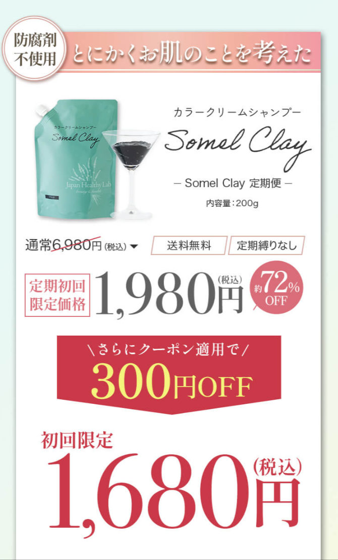ソメルクレイ最安値の最大の理由です。他のサイトで仮に少し安く見えたとしても、この初回割引のインパクトには敵いません。